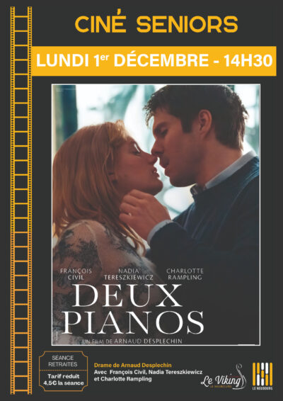 Prochainement Ciné Seniors vous propose le lundi 1er décembre à 14h30 DEUX PIANOS 🎬 Nouveau look, même rendez-vous !Le Ciné Séniors se ... Cinéma lundi 01 décembre Ciné seniors - DEUX PIANOS