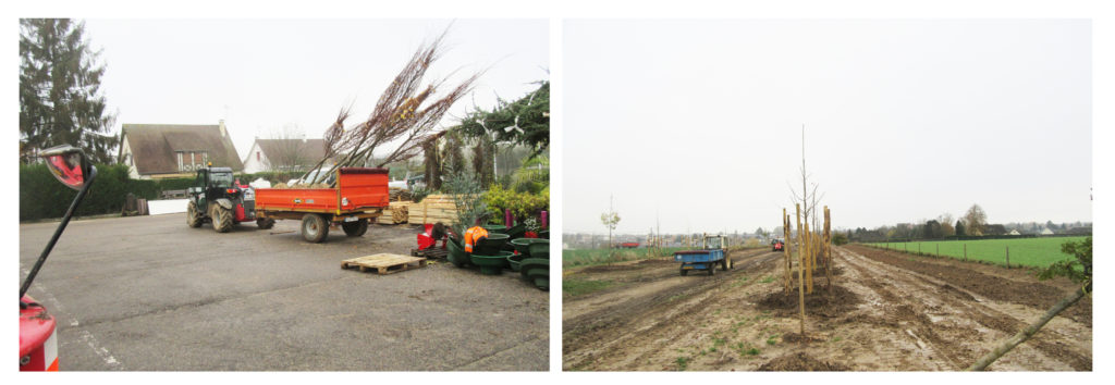 Pour favoriser l’enracinement de l’arbre, on place dans le trou de plantation un apport d’amendement concentré avec des mycorhizes. Puis, les plants sont placés dans les trous et redressés. On remet alors de la terre au pied et on la tasse. Un tuteur est posé sur la tige de l’arbre afin de favoriser le développement de sa flèche.