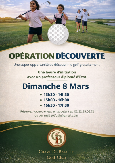 L'association sportive Golf Champ de Bataille (ASCB) vous propose des opérations de découverte du Golf le dimanche 8 mars. C'est ...