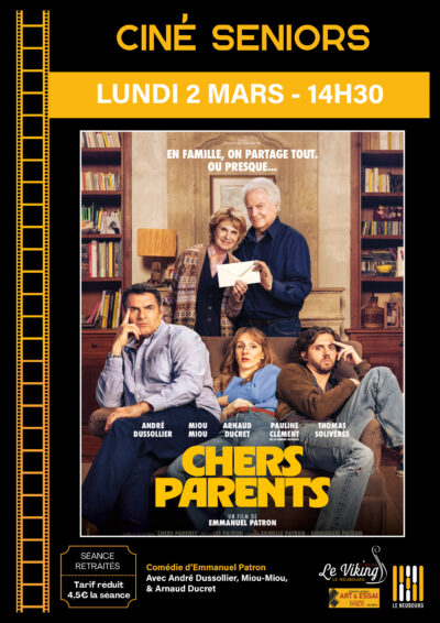 Ciné Seniors vous propose le lundi 2 mars à 14h30 CHERS PARENTS Comédie d’Emmanuel Patron Avec André Dussollier, Miou-Miou & Arnaud ...
