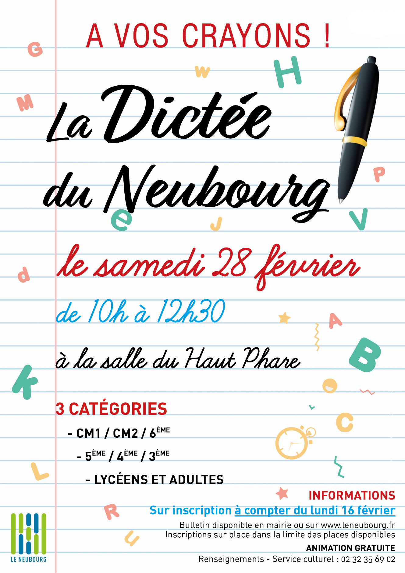 Samedi 28 février, de 10h à 12h30, la salle du Haut Phare accueillera la 8ᵉ édition de la Dictée du Neubourg, un événement désormais incontournable.